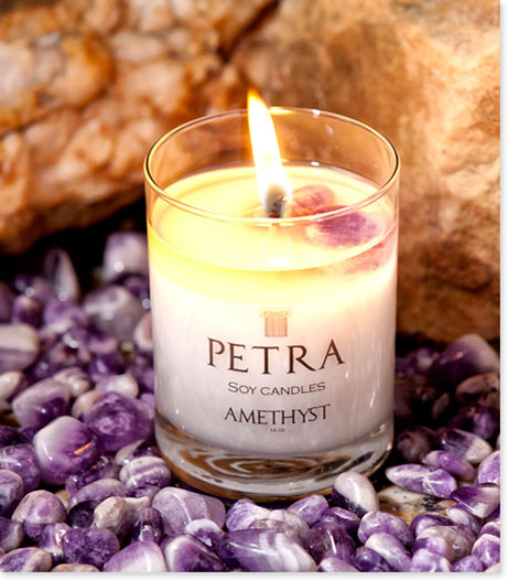 AmethystStress Relief & IntrospectionA peaceful lavender aroma that will infuse the senses with tranquil and soothing thoughts. By burning this candle along with the Amethyst gemstones, an inspirational essence will be released into the environment. This will relieve stress and promote introspection.$45.00 Includes 2 genuine Amethyst gemstones and a natural Agate that can be used as a snuffer/coaster.