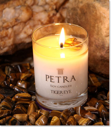 Tiger EyePeace & Emotional BalanceAn elevating, vanilla aroma that will infuse the senses with clear thoughts and logical thinking. By burning this candle along with the Tiger Eye gemstones, a grounding and energetic essence will be released into the environment. This will bring about peace and emotional balance.$45.00 Includes 2 genuine Tiger Eye gemstones and a natural Agate that can be used as a snuffer/coaster.